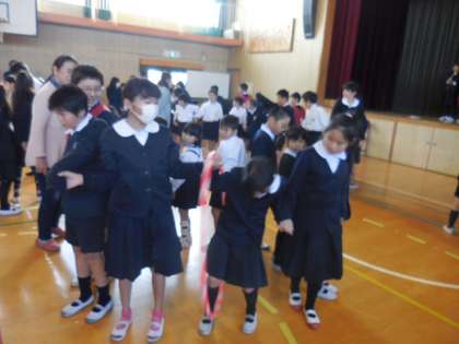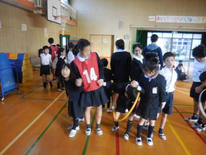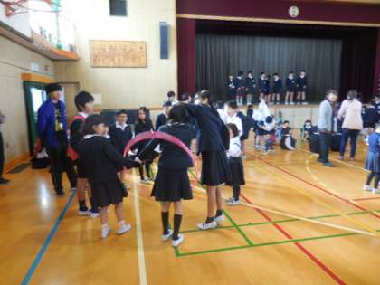 どの班も仲よくしっかりと手をつないだまま、手脚をうまく使って体操の輪を次々に通していきました。