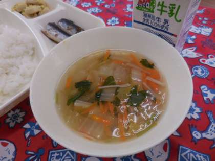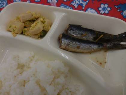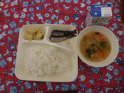 献立は、いわしの生姜煮、うすくず汁、高野豆腐の卵とじ、ごはん、牛乳でした。