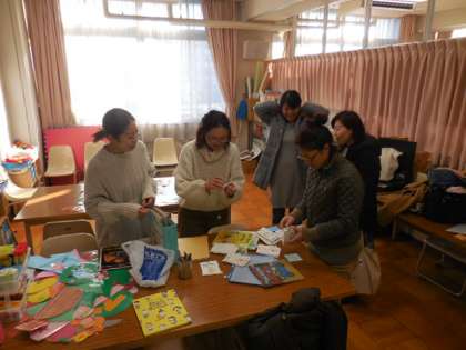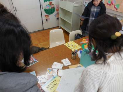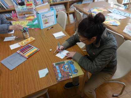 朝の読み聞かせを終えたとしょとしよの皆さんは図書室へ行き、児童にお薦めの本の紹介カードを作成されていました。