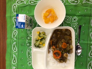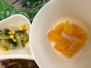 献立は、冬野菜のカレーライス、ブロッコリーとコーンのサラダ、黄桃(缶)、牛乳でした。