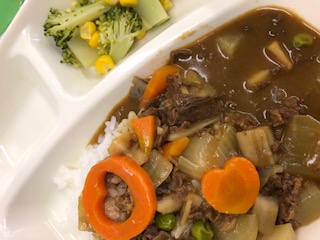 今日の給食での冬野菜は、カレーライスのれんこん、だいこん、にんじん、サラダのブロッコリーでした。冬野菜のカレーライスは、3つの冬野菜が入っていてとてもおいしくいただきました。