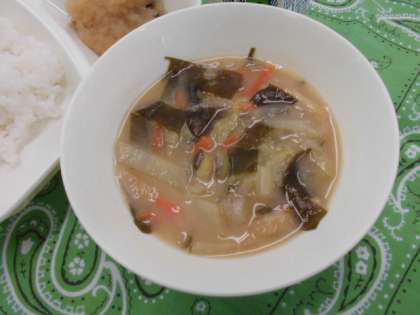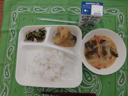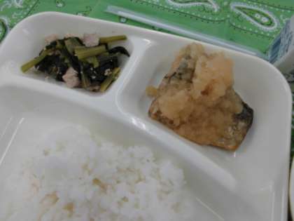 献立は、さばのみぞれかけ、みそ汁、小松菜の煮びたし、ごはん、牛乳でした。