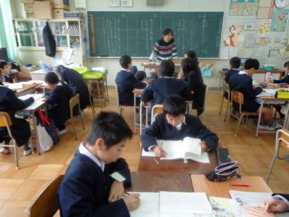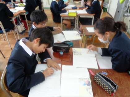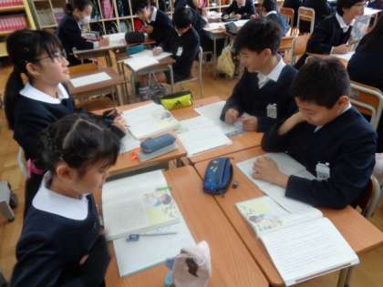 登場人物の心情を考え、班で話し合ってまとめていました。