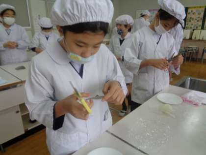 各自がデザインした通りに、のりを食用はさみで切っています。
