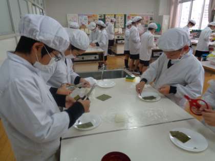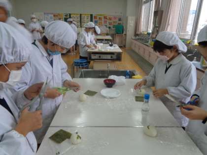 切ったのりを、直接おにぎりにはりつけてできあがりです。