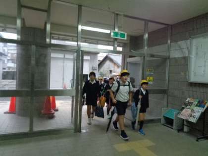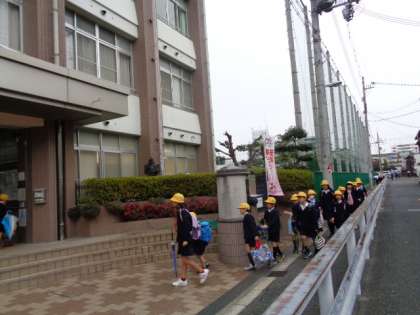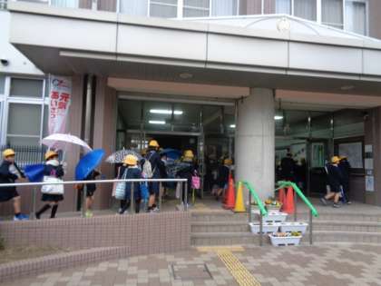雨模様ですが、班長を先頭に集団登校で登校してきています。