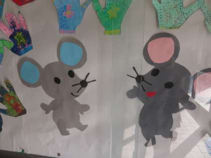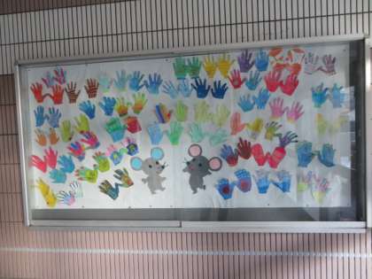 ねずみ年にちなんで、ねずみを中心に手袋をはめた手のひらをいっぱいにひろげています。