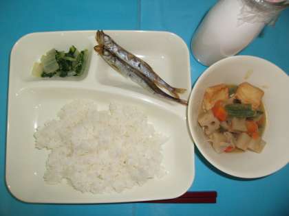 焼きししゃも 鶏肉とじゃがいもの煮もの おおさかしろなのごまあえ
