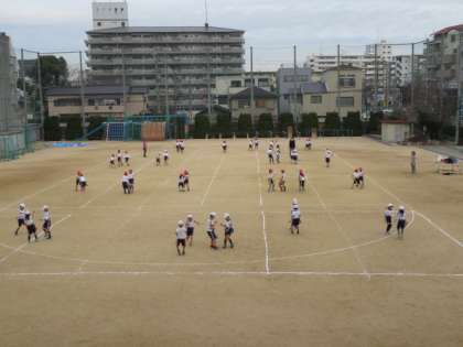 2年生が、体育の時間に運動場で「しっぽとり」などの鬼ごっこをしていました。