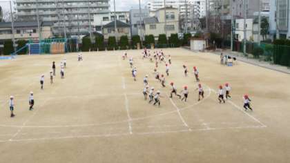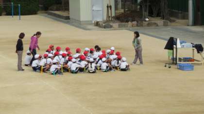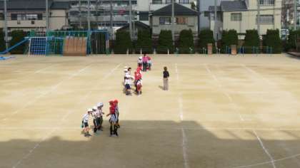 ゲームの方法やルールなどを確かめた後、チーム対抗で「たから運び鬼ごっこ」(通り抜け鬼ごっこ)が始まりました。