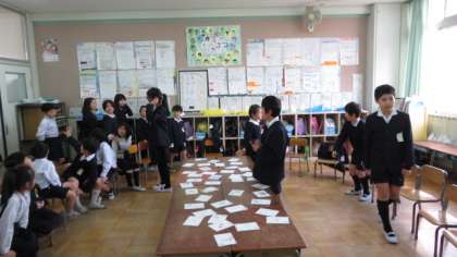 前半の1回戦が終わり、後半の2回戦に向けて司会進行児童が替わると同時に、偶数番号班は、違う奇数番号班と対戦するために教室を移動しました。