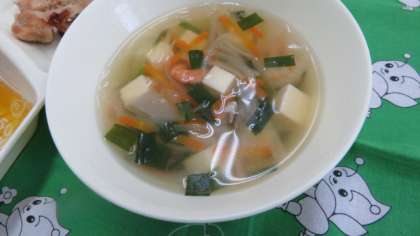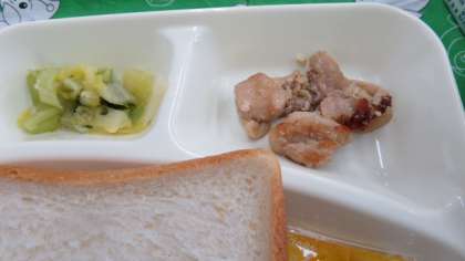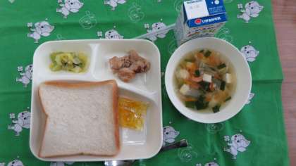 献立は、鶏肉のオイスターソース焼き、えびととうふのスープ、チンゲン菜のピリ辛あえ、マーマレード、食パン、牛乳でした。