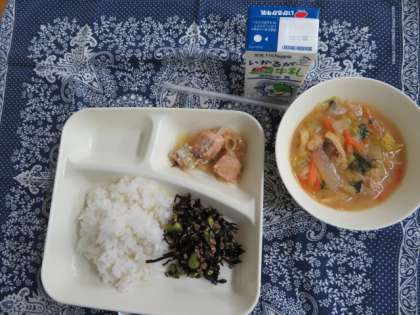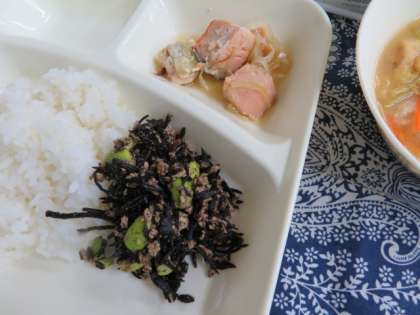 栄養たっぷり枝豆ひじきごはん、さけのさわやかレモン焼き、冬野菜のみそ汁、牛乳でした。