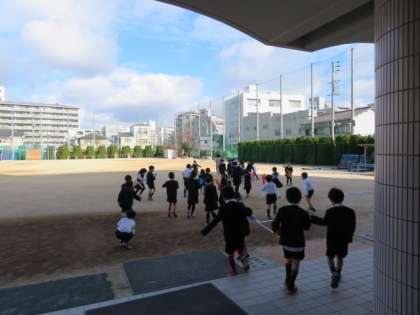 全員の凧ができあがったので、運動場へ出ていよいよ凧あげです。