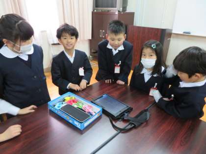 2組も、2年生がタブレット端末で作った凧作りの手順を見ながら凧を作成します。