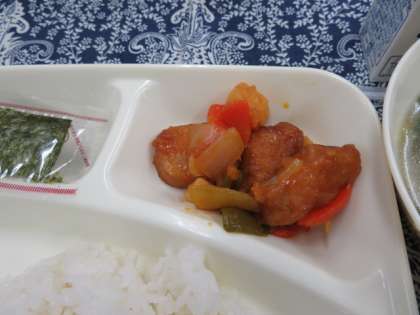 献立は、酢豚、中華スープ、焼きのり、ごはん、牛乳でした。