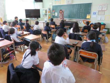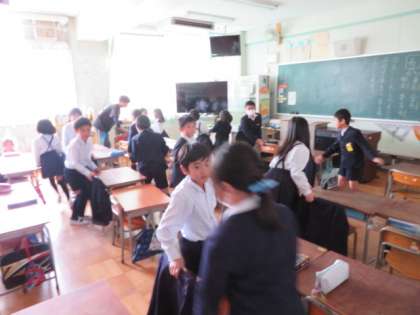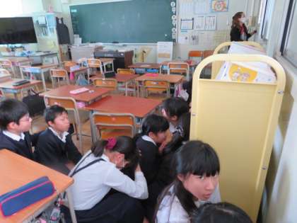校内放送で不審者が校内に侵入したとの知らせが入り、各教室では施錠し子どもたちは指示に従って身構えています。
