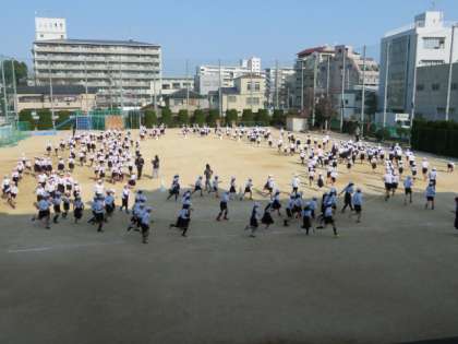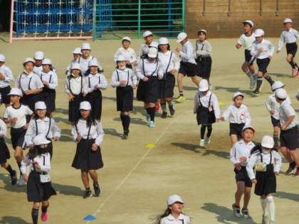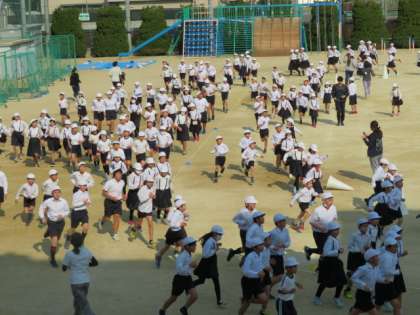 1・2年生がトラックのラインの内側を、3・4・5・6年生はラインの外側を走っています。