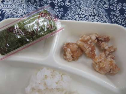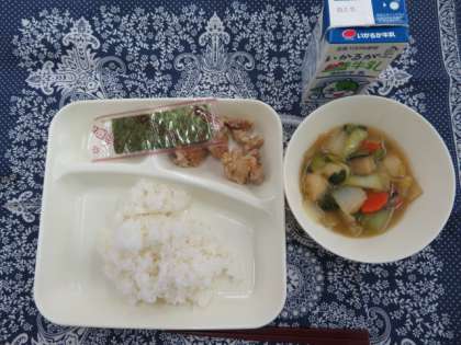 献立は、鶏肉のから揚げ、丸天と野菜のうま煮、焼きのり、ごはん、牛乳でした。