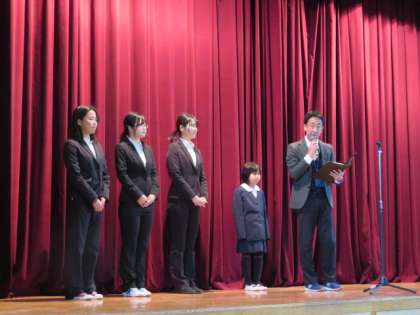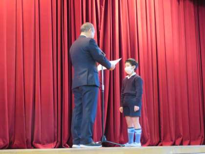 児童朝会で、歯と口の健康活動の優良学校表彰、2年生の転入児童の紹介、「いのちの大切さを伝える」作文の児童表彰等を行いました。