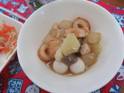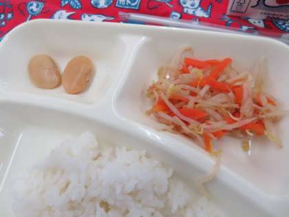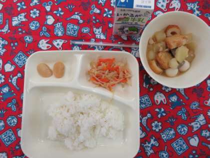 献立は、関東煮、もやしとにんじんの甘酢あえ、白花豆の煮もの、ごはん、牛乳でした。