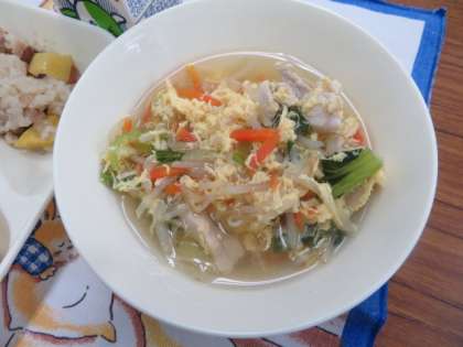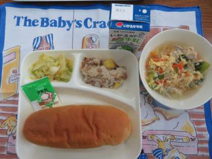 献立は、中華おこわ、玉子スープ、キャベツのオイスターソース炒め、パン、マーガリン、牛乳でした。