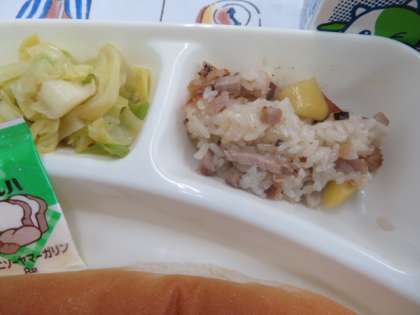 給食では、焼き豚、栗、干しシイタケの入った「中華おこわ」でしたが、もっちりとした食感と具材の風味でとてもおいしくいただきました。