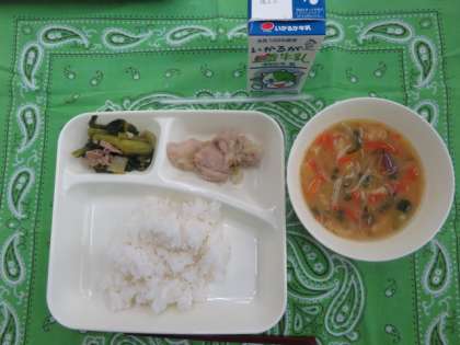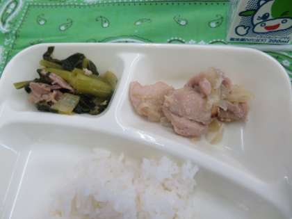 献立は、鶏肉の柚子塩焼き、さつまいものみそ汁、小松菜の煮びたし、ごはん、牛乳でした。