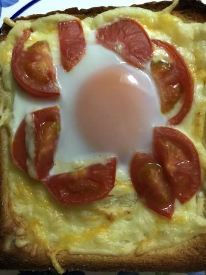 1.しょくパンのまわりにチーズをのせ、まんなかをへこませ、そこにたまごをわる。