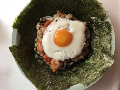 ・わたしはめんつゆではなくて、キムチなっとうをいれ、のりをそえて