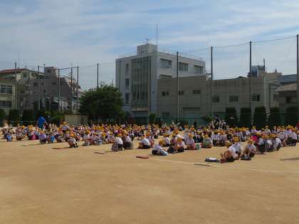 登校後は、手の消毒、健康観察をしてから運動場に整列しました。