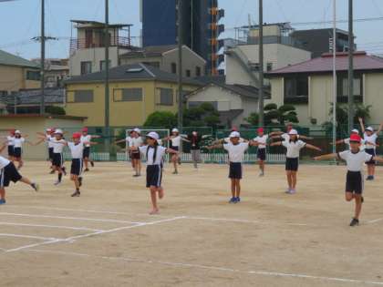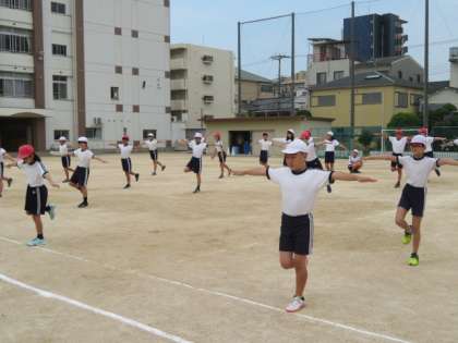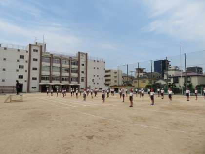 6年生が、運動場でのソーシャルディスタンスを意識した体育の学習をしていました。