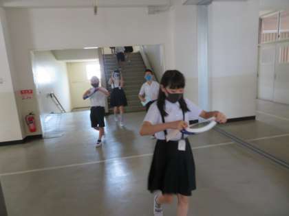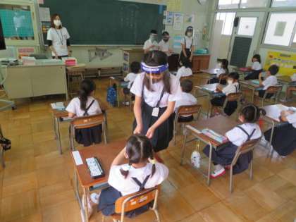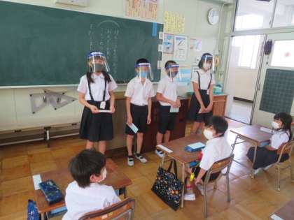 6年生は、早速フェイスシールドを着用して、1年生に手渡しました。