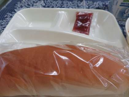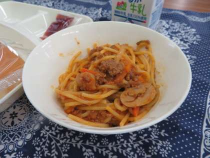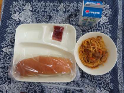 献立は、スパゲッティミートソース、コッペパン、いちごジャム、牛乳でした。
