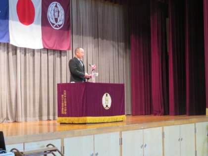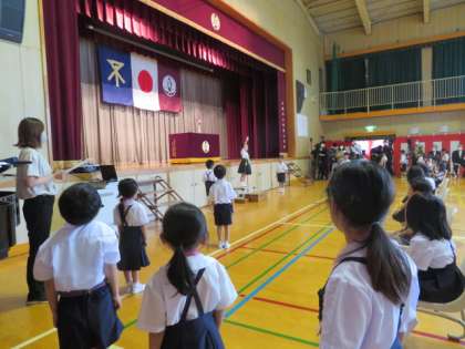 今回の入学式はすでに1年生が学校で学習していることもあり、1年生のしっかりと成長した姿も保護者の皆さまに観ていただこうと入場後に一人ずつ担任から名前を呼びあげて舞台下の台上で返事をしました。