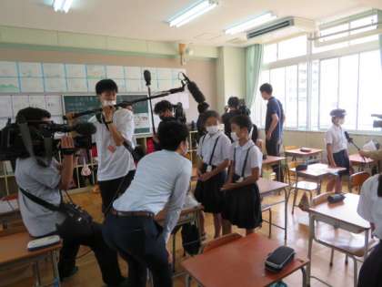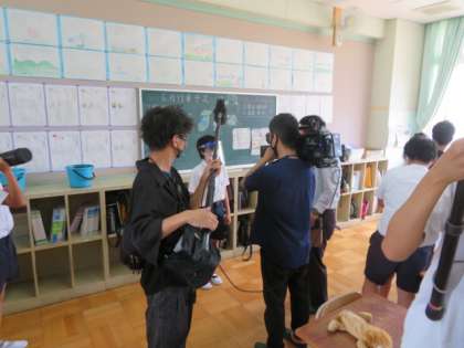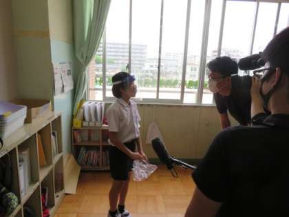 休み時間には、報道数社より6年生児童が通常授業の開始とフェイスシールドを着用しての学習活動について等、インタビューを受けていました。