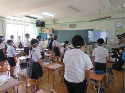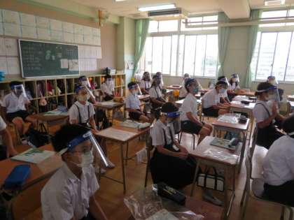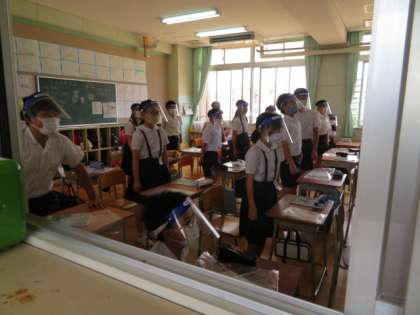 4時間目は、6年生がフェイスシールドを着用しての英語の授業をしていました。