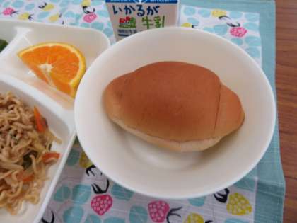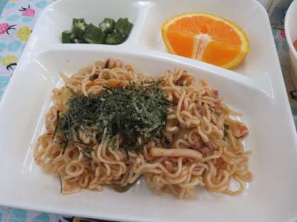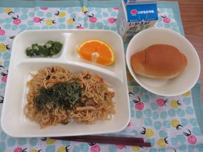 献立は、焼きそば、オクラの甘酢あえ、1/2黒糖パン、オレンジ、牛乳でした。