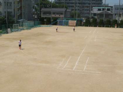 運動場では、ラインテープ掃きをしていました。