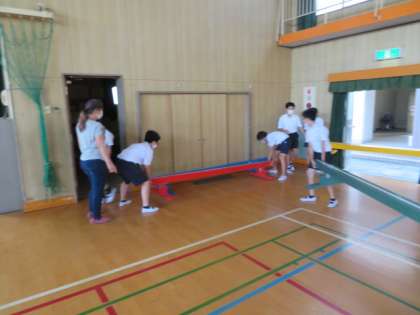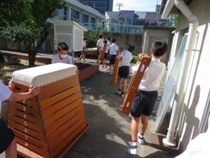 今朝は、6年1組児童が体育学習の備品を講堂に戻してくれました。