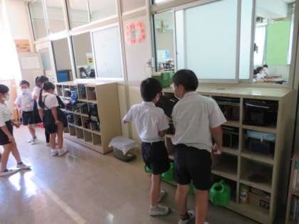 習字道具の名前や置く場所、初めの使い方等、いろいろな説明をよく聴いて、活動していました。
