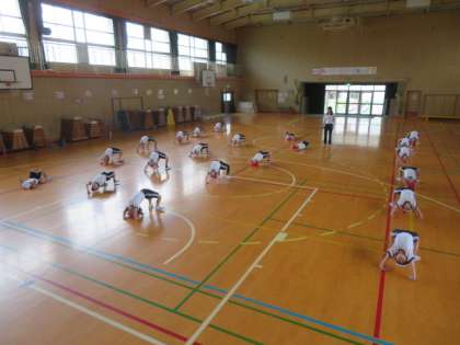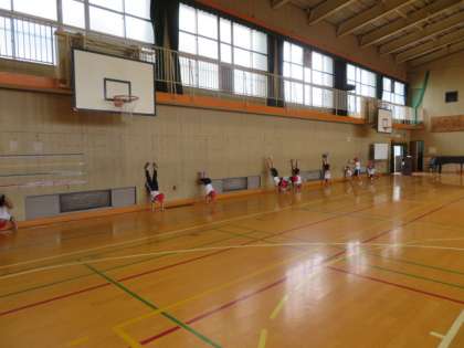 講堂でも、運動前の手洗いや密になることを避けたりするなど、いろいろと配慮しながら存分に体を動かせるように体育学習をしていました。