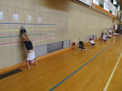 準備運動に続いて、ブリッジなどの運動や壁倒立などの運動をして体を慣らしていました。