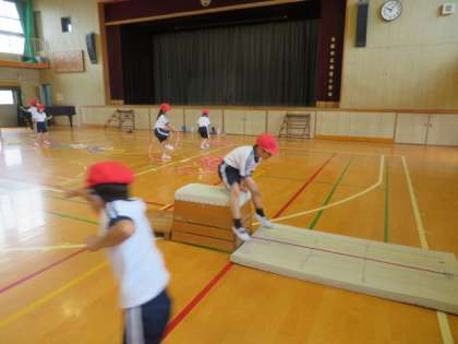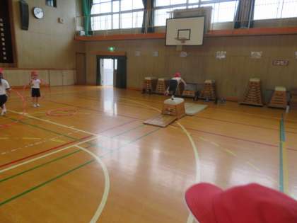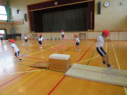 跳び箱を使った運動遊びでは、オーソドックスな開脚跳び越し、台に跳びのったり、跳びおりたり、などいろいろな動きを楽しんでいました。