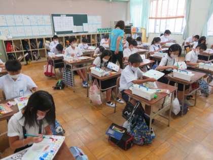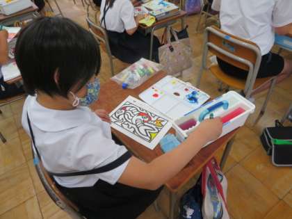 5年2組では、図画工作担当によるザリガニの線画に水彩の彩色をする活動をしていました。