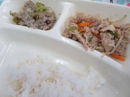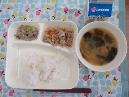 献立は、豚肉と野菜の炒め物、みそ汁、キャベツの赤紫蘇あえ、ごはん、牛乳でした。