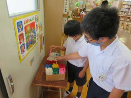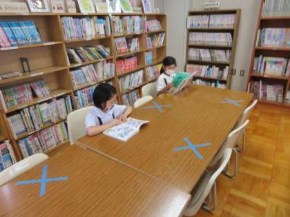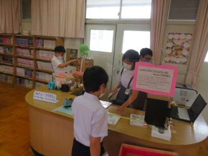 給食の時間に図書館開放の案内放送があり、お昼の時間に本を借りに来たり、自由読書を楽しんだりする児童がいました。