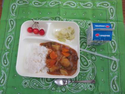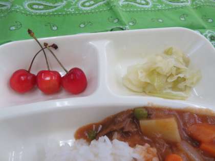 献立は、ハヤシライス、キャベツのゆずドレッシング、さくらんぼ、牛乳でした。