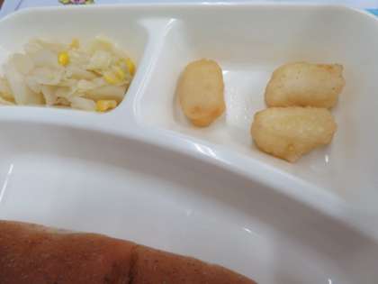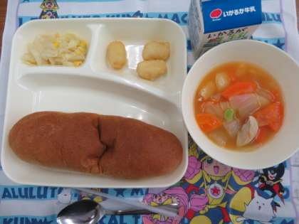 献立は、いかてんぷら、フレッシュトマトのスープ煮、サワーソテー、ライ麦パン、牛乳でした。