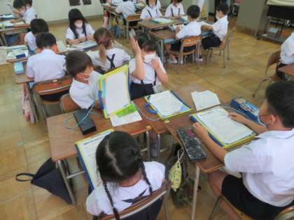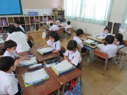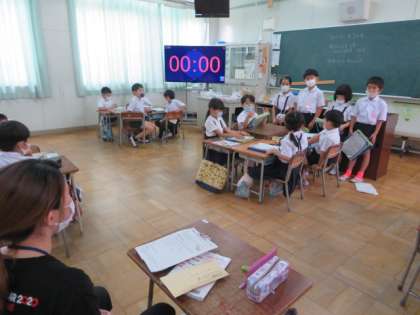 2年生が、グループごとに明日の町たんけんに備えて質問項目の最終確認、インタビューの仕方や挨拶の練習を行っていました。